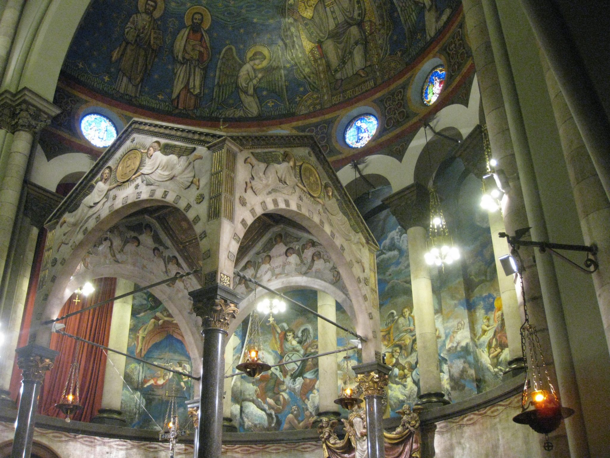 Aquest mural es va fer fa uns 15 o 20 anys. Més tard, des de fa sis anys aproximadament, es va decidir per la instal·lació de la cortina, com havia estat en altres èpoques. Es va pensar així perquè absorbeixen la imatge de la Verge, distreuen als fidels, i no tenen valor artístic ja que les representacions no han guardat jerarquia ni primacia dels personatges que representen, fins i tot cpnté algun dimoni i forques, impròpies per veure’s sobre un altar. No dubtem de la bona voluntat dels seus autors ni de les persones que van intervenir en la decisió i execució de l’obra, i aquí estan, però des del moment en què es van cobrir la imatge de la Verge santíssima de Montalegre ha guanyat la primacia que es mereix. Després de la reparació corresponent, el mural es tornarà a cobrir.