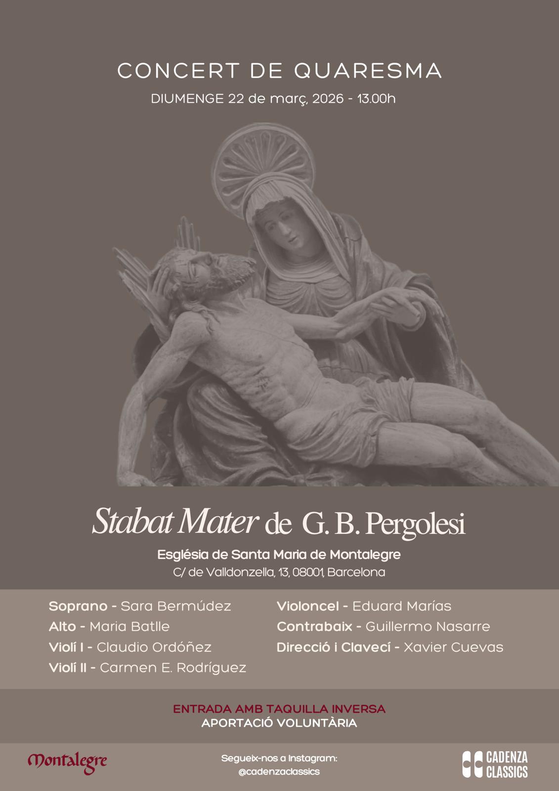 El diumenge dia 22 de març del 2026 a les 13h, s’oferirà el Concert de Quaresma Stabat Mater de G.B. Pergolesi, de taquilla inversa, aportació voluntaria. Hi intervenen: