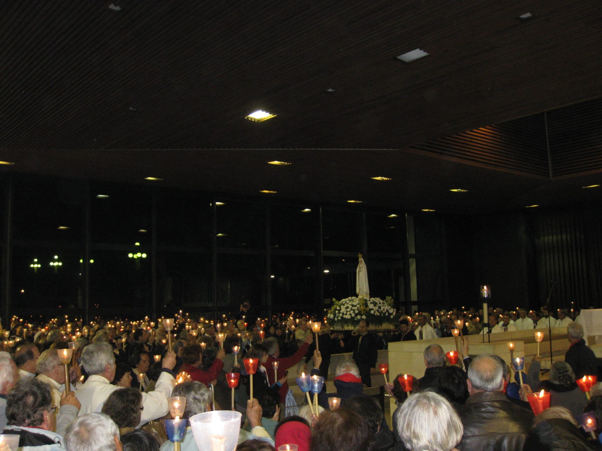 A continuació, vam visitar l’exposició del Cor, l’església de la Santíssima Trinitat on hi poden estar assegudes a prop de 9000 persones i hi poden concelebrar la missa uns 100 preveres; vam fer-nos fotos davant la Creu, la imatge del beat Joan Pau II i la Basílica. Vam seguir la visita fins l’espai dedicat a un bloc del Mur de Berlín, i alguns peregrins ja van iniciar les compres de rosaris i llibres sobre els missatges de Fàtima per tal d’obsequiar a familiars i amics. Després d’un animat dinar amb cants i balls populars d’altres peregrins que hi eren a la residència, i passat un breu descans, vam anar al Museu i Exposició del santuari. El curtmetratge i la visita ens van situar de ple en tota la generositat del poble portuguès vers la Mare de Déu. La corona de la Verge, en la qual s’havia encastat la bala que va travessar al beat Joan Pau II en l’atemptat del que va ser objecte ens va permetre reviure el miracle de la Verge d’haver salvat al sant pare. Havíem de veure la basílica i resar, és clar. Així que tots els peregrins ens vam retrobar a l’hora de sopar. Sens dubte havien d’agafar forces per anar al rosari d’aquella nit del dissabte 25 de maig. Ens esperarien unes emocions profundes perquè no és habitual participar en una pregaria en la que s’hi apleguen mils de persones, més que la nit anterior. En aquella nit, un dels peregrins, l’Ignacio, va ser un dels porteadors voluntaris de la imatge de la Verge de Fàtima.