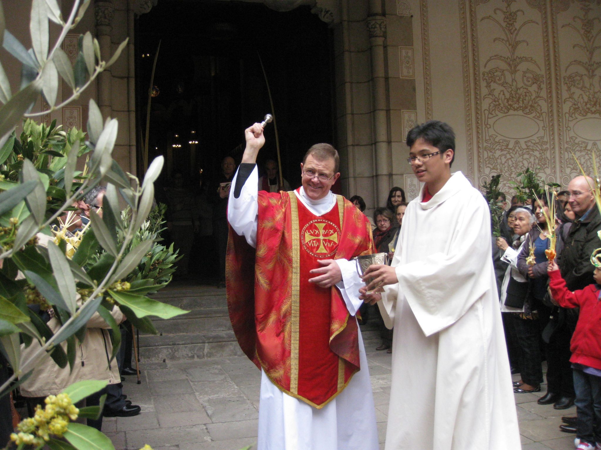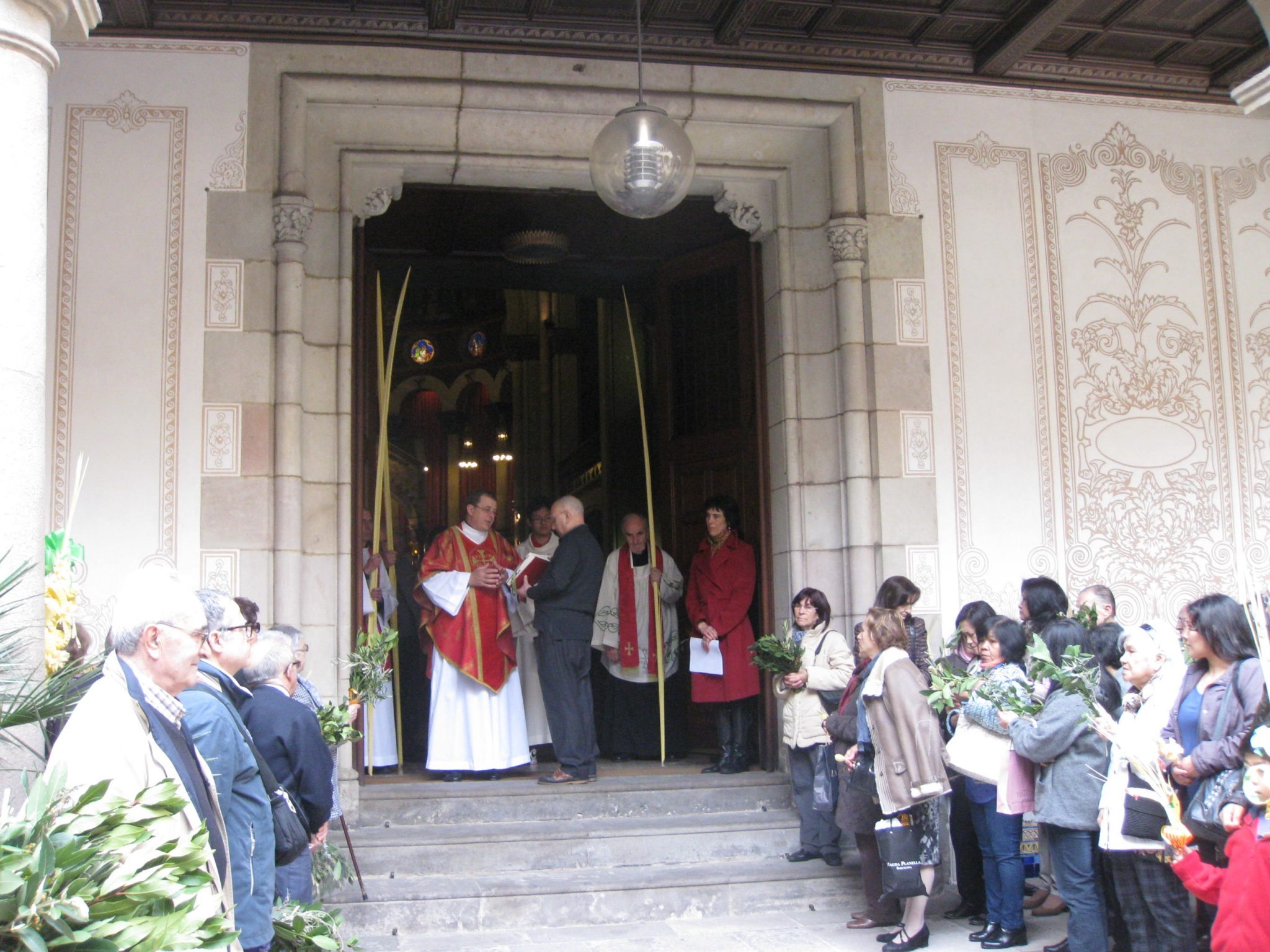 Uns minuts abans de la celebració de la santa missa solemne, els fidels vam sortir al Pati Mannig de l’Església de Santa Maria de Montalegre. Per aclamar el Senyor vam portar rams de llorer, petites palmes, i palmons: commemoràvem l’entrada del Senyor a Jerusalem.