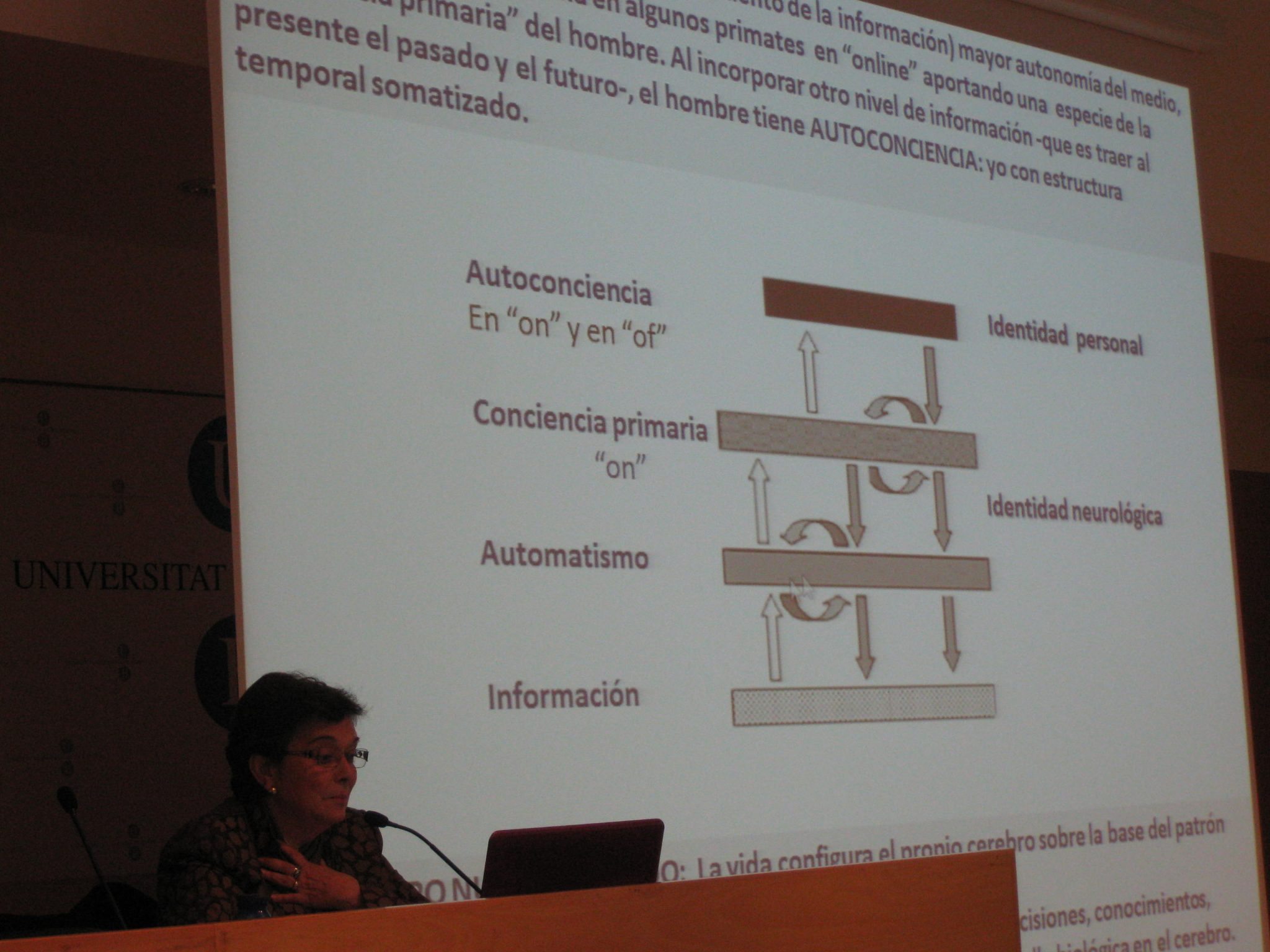 Seguidament, després d’explicar la teoria de l’evolució de Darvin, va explicar la posició de la biologia actual, entre d’altres coses, la transformació genètica, la selecció natural, la micro evolució, la macro evolució, la transmissió d’una informació pròpia, la informació genètica i la informació epigenètica. Va concloure la seva àmplia exposició amb el cervell humà, distingint-lo especialment d’altres cervells de primats com els del ximpanzé, indicant amb insistència que l’únic ser que existeix amb la capacitat de la llibertat és l’ésser humà perquè cada un pot alliberar-se de l’automatisme de la pròpia biologia.