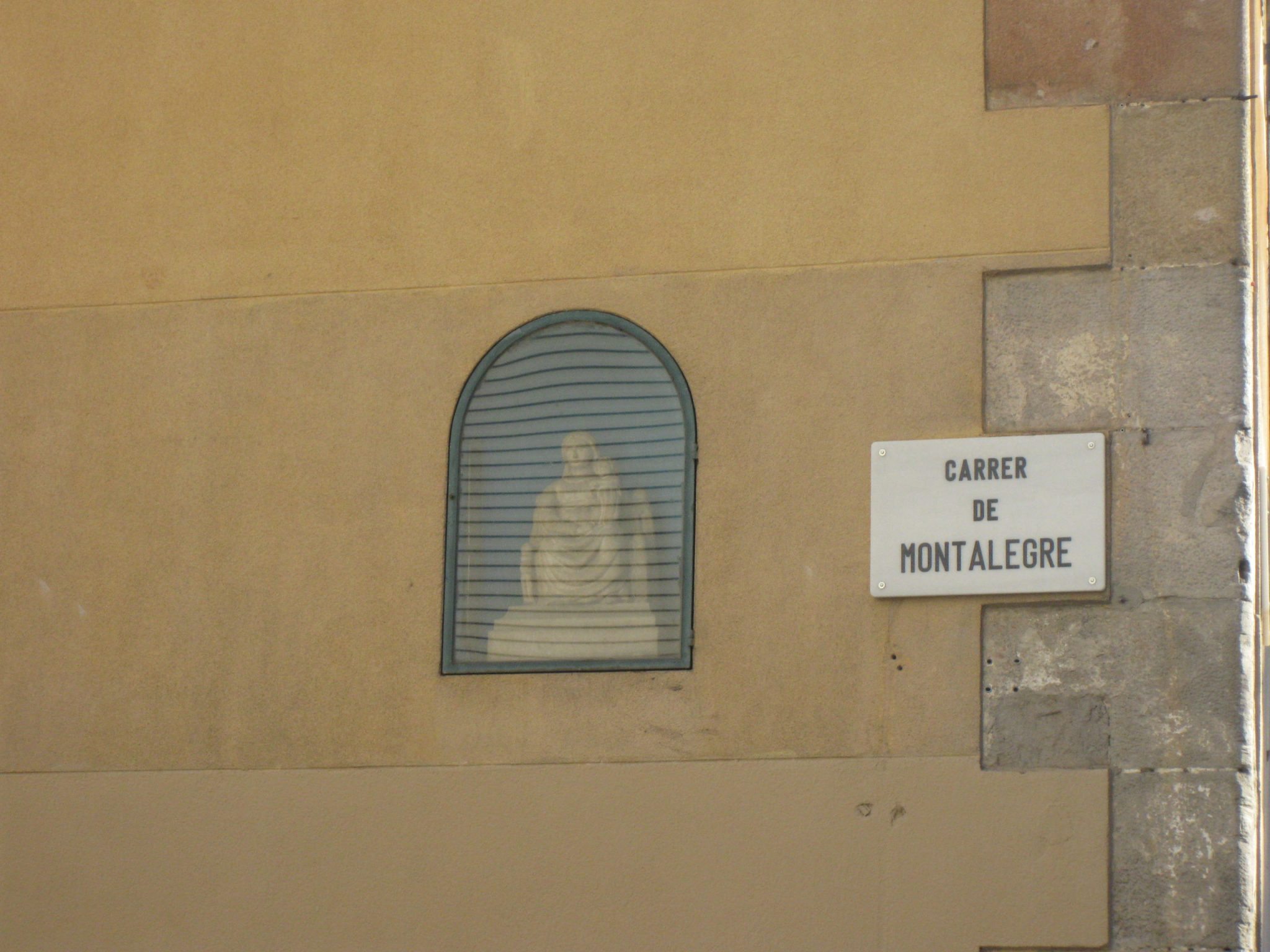 I abans d’entrar o al sortir del temple, ens podem aturar a contemplar la primera imatge, de pedra, de Nostra Senyora de Montalegre que es troba en una fornícula, a la paret exterior de l’edifici a la cantonada dels carrers Montalegre amb Valldonzella, una imatge que data de finals del segle XIV o de principis del XV.