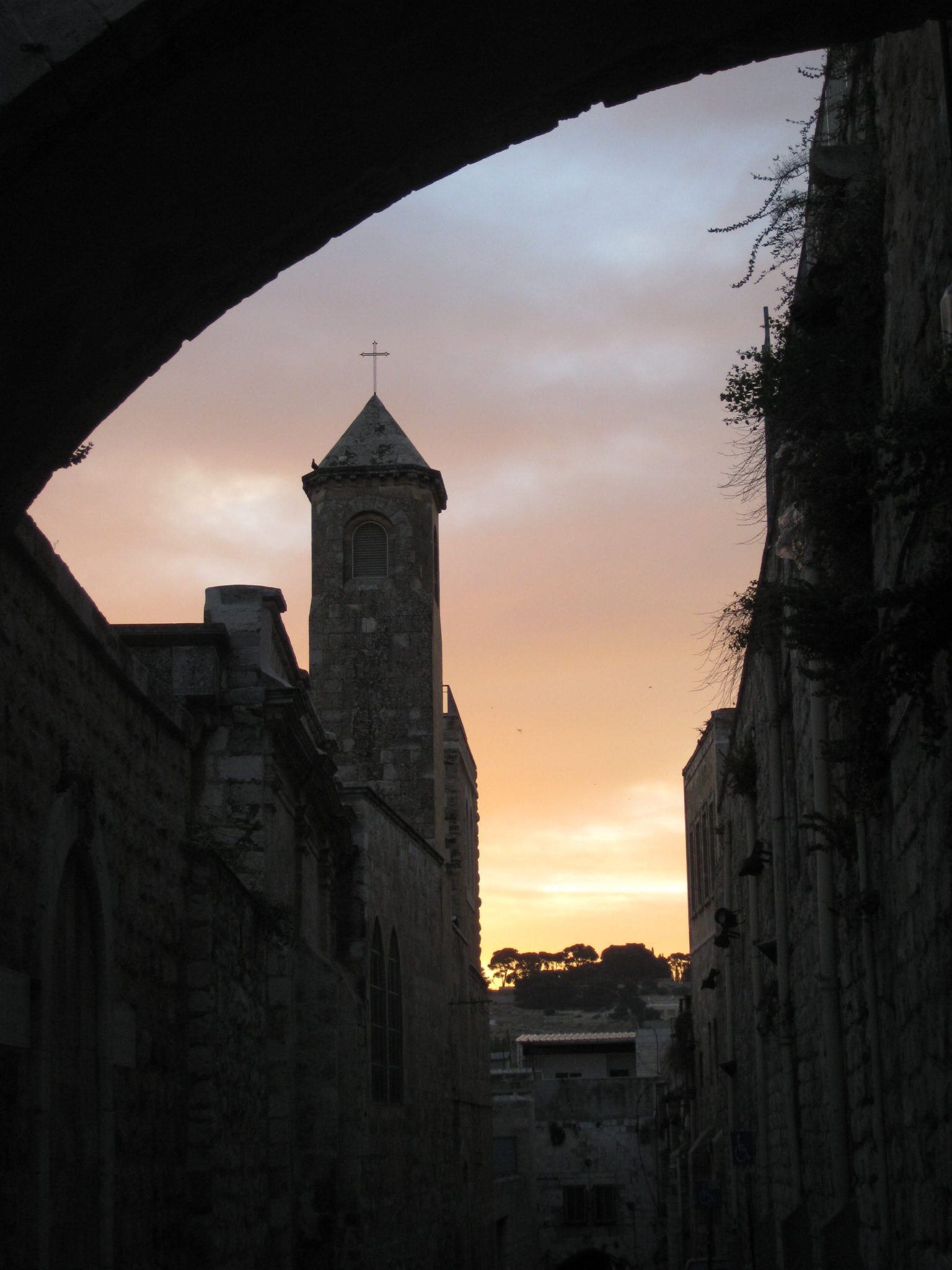 Dejando atrás aquel mar que recibe el nombre de muerto pues no vive ningún ser vegetal o animal en él, íbamos a tener una gran sorpresa: de repente nuestros ojos contemplaron la entrada a Jerusalem. En un punto estratégico, la visión de la ciudad, que tantas ganas teníamos de pisar, estaba a nuestros pies. Allí brindamos con un poquito de vino israelí y comimos un trocito de pan ácimo. Vimos allí el atardecer del día 20 de mayo. Por sorpresa nos vino a saludar el sacerdote Mn. Santiago Quemada que vive en Jerusalem desde hace bastantes años, y al que le entrevistamos unas semanas antes de ir a aquel país *. Estuvimos todos los peregrinos con él, en animada tertulia después de cenar; nos explicó cómo se desarrolla la labor del Opus Dei en Israel y nos situó en la realidad de las relaciones con el pueblo Palestino.