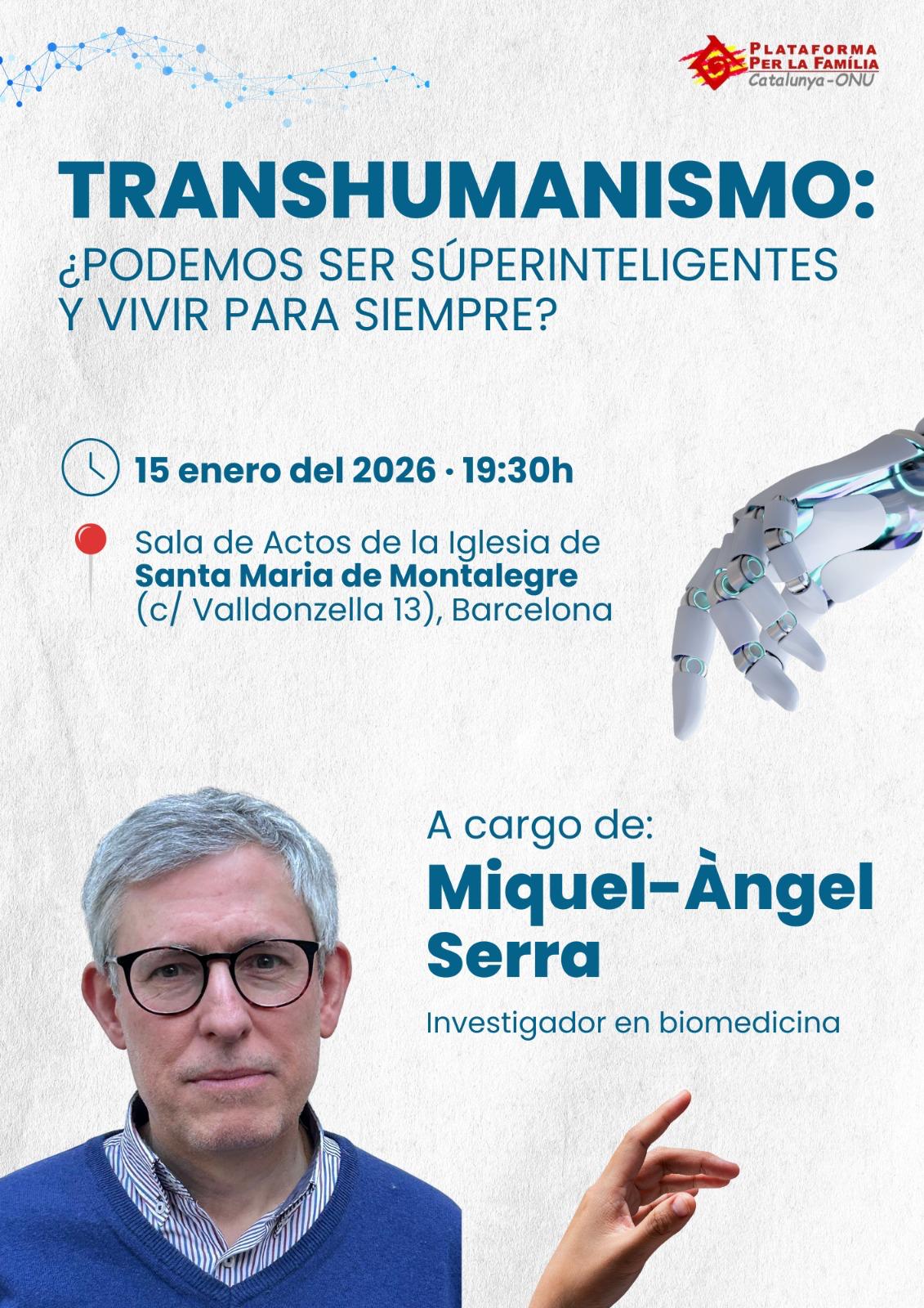 El jueves 15 de enero de 2026, el Sr. Miquel Ángel Serra ofrecerá la conferencia Transhumanismo ¿podemos ser superinteligentes y vivir indefinidamente?  A las 19.30h en la sala de actos de Montalegre.